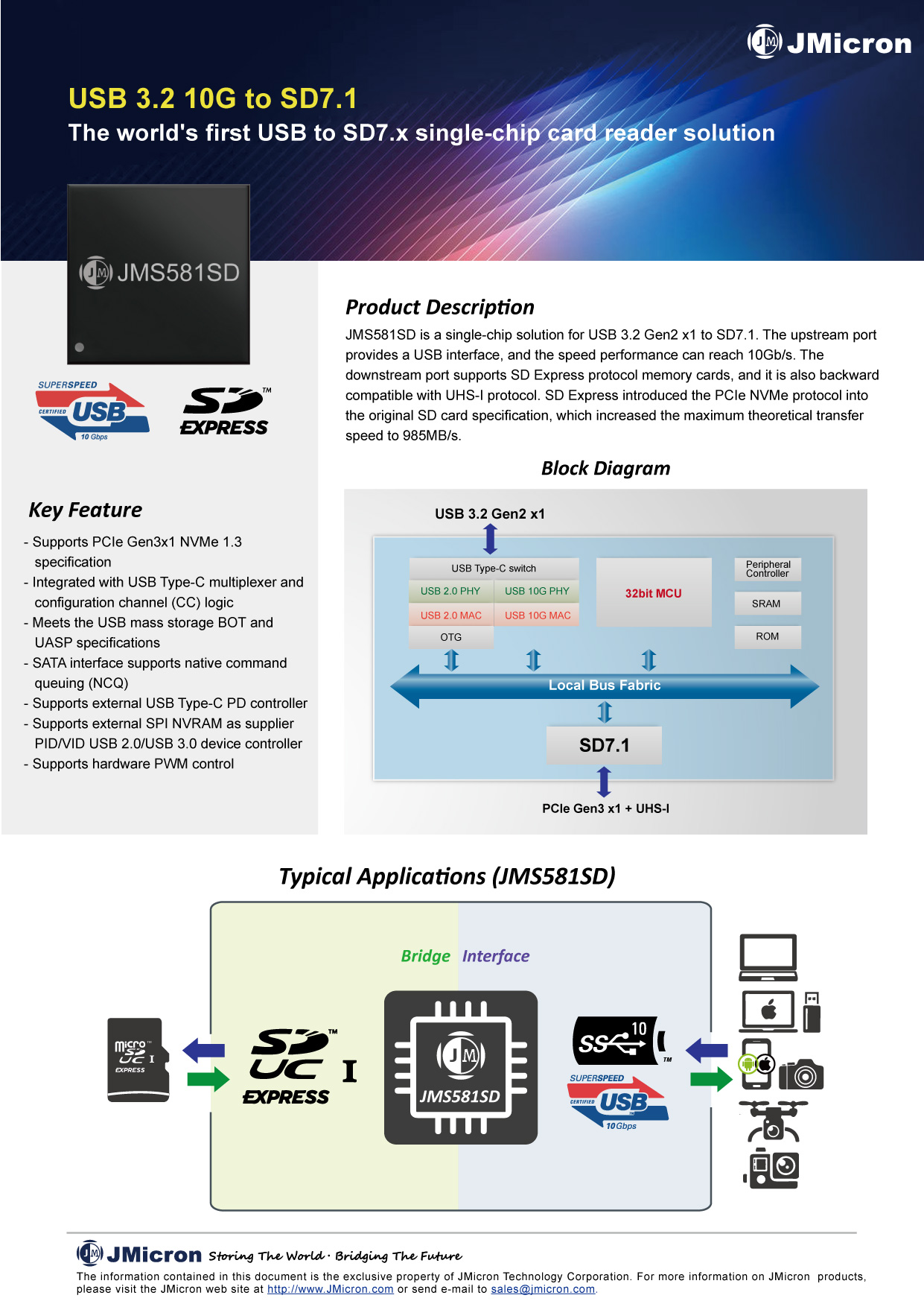 The JMS581SD is a system-on-chip solution that bridges USB 3.2 Gen2 x1 with SD7.x interfaces. The device delivers USB data speeds of up to 10Gb/s on the upstream port, while supporting both SD7.x and UHS-I memory cards on the downstream port.