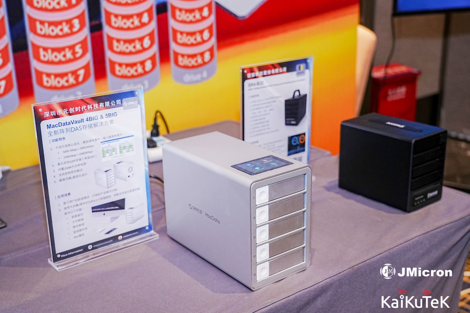 During the event, JMicron showcased its next-generation multi-bay disk solution, JMS591, a hardware RAID controller supporting dual upstream interfaces of USB 20Gbps and eSATA and connecting up to five SATA devices. Designed for applications such as AI NAS and security systems, JMS591 features a new hardware RAID engine that significantly improves rebuild speed while maintaining backward compatibility with JMB393. JMicron also presented its JMS581 series external multimedia backup solutions and JMS586 series NVMe SSD bridge solutions, demonstrating a diversified high-speed storage portfolio.